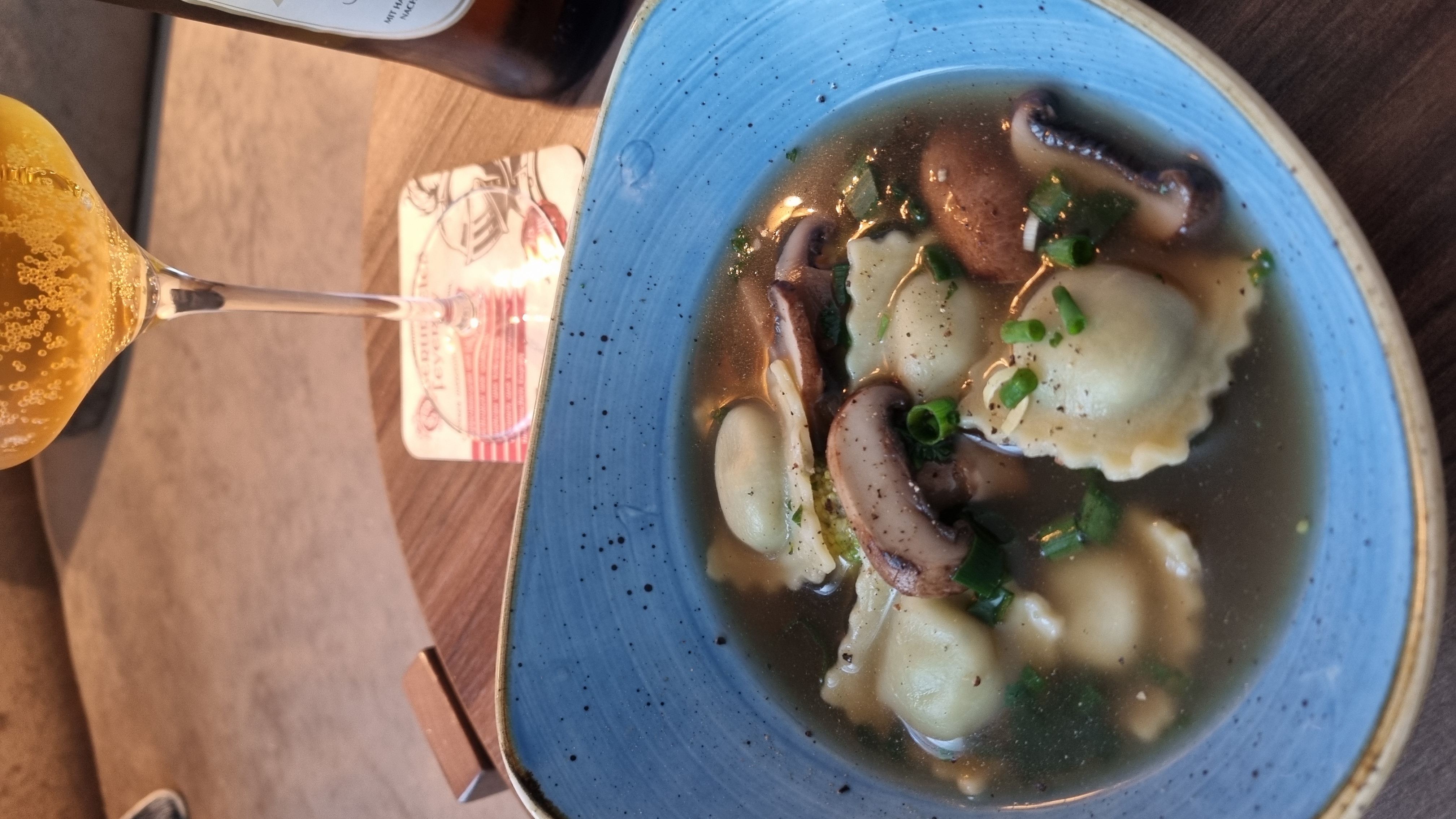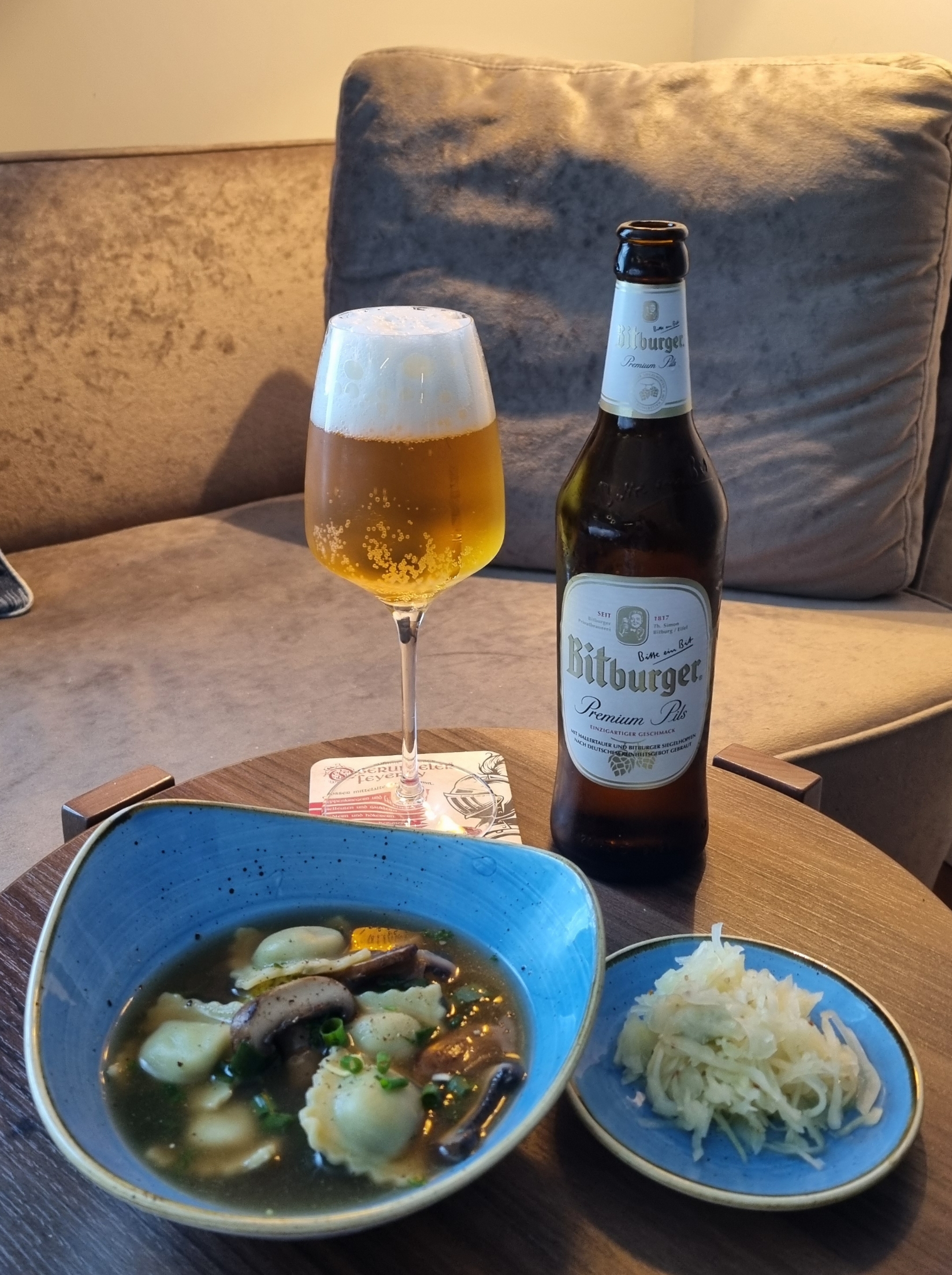 이번에는 맥주와 함께 슈바벤식 라비올리 수프와 **슈바이네크라우트(절인 양배추)**를 곁들였습니다. 슈바벤 지방에서 자주 볼 수 있는 **마울타셴(Maultaschen)**이라는 라비올리 스타일의 만두는 육수에 담겨 따뜻하게 제공되며, 담백한 버섯과 함께 깊은 맛을 냅니다.
