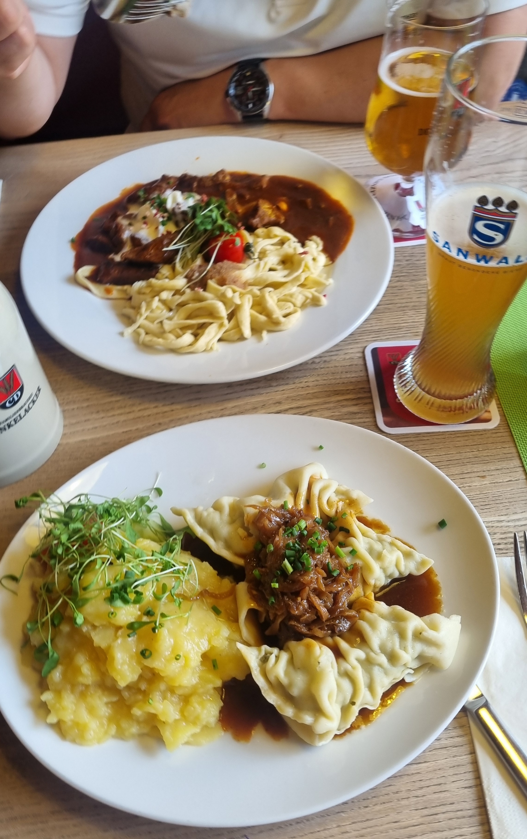 1. 위쪽 접시 – 슈바벤식 쇠고기 스튜 (Gulasch) + 스페츠레 (Spätzle)