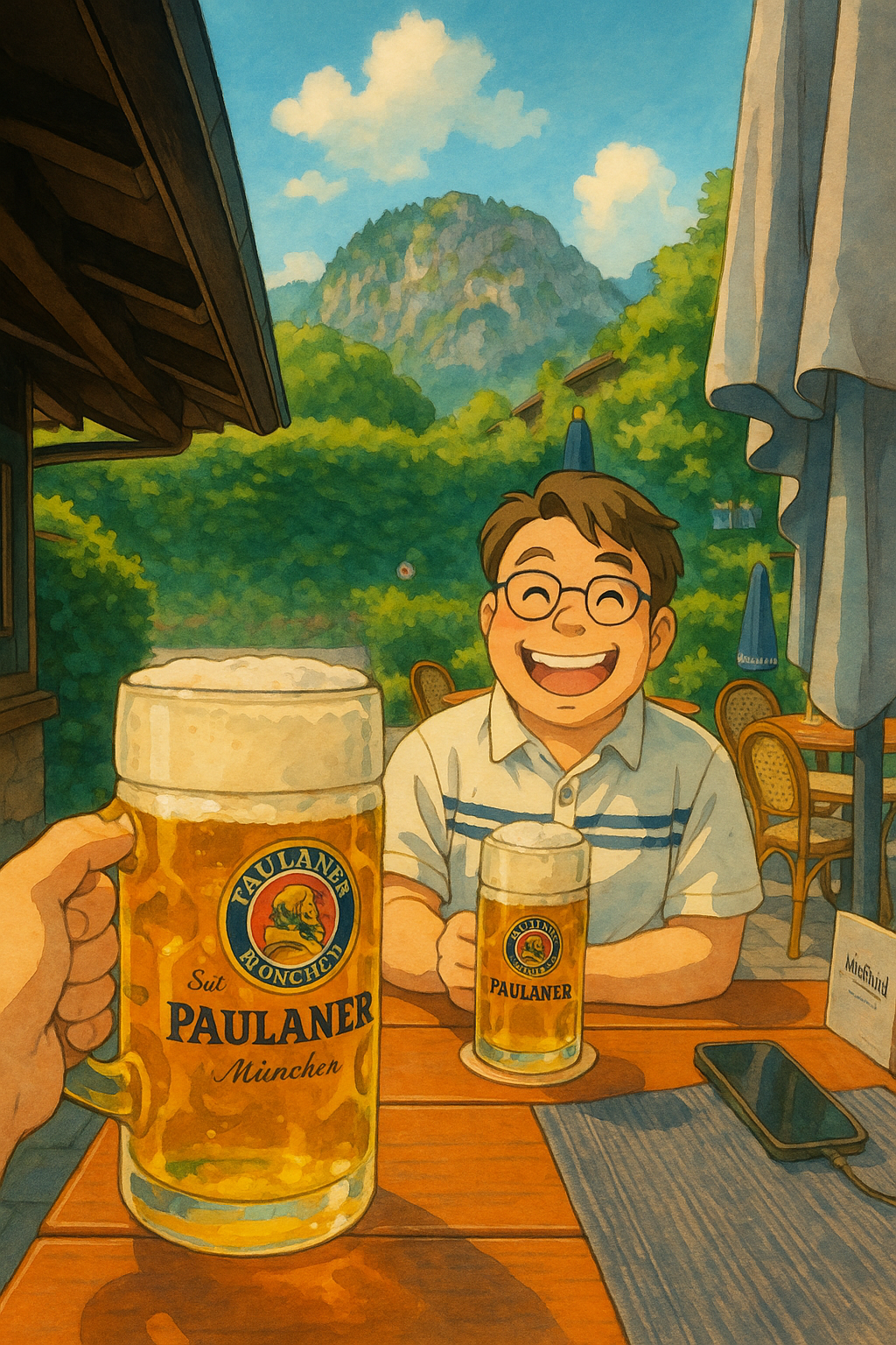 뮌헨의 자존심, 파울라너 맥주. 투명한 금빛과 부드러운 거품, 은은한 홉의 향이 입안을 감싸줍니다. 산자락 테라스에서 마시는 이 한 잔은 그냥 ‘맥주’가 아니라 ‘힐링’입니다.