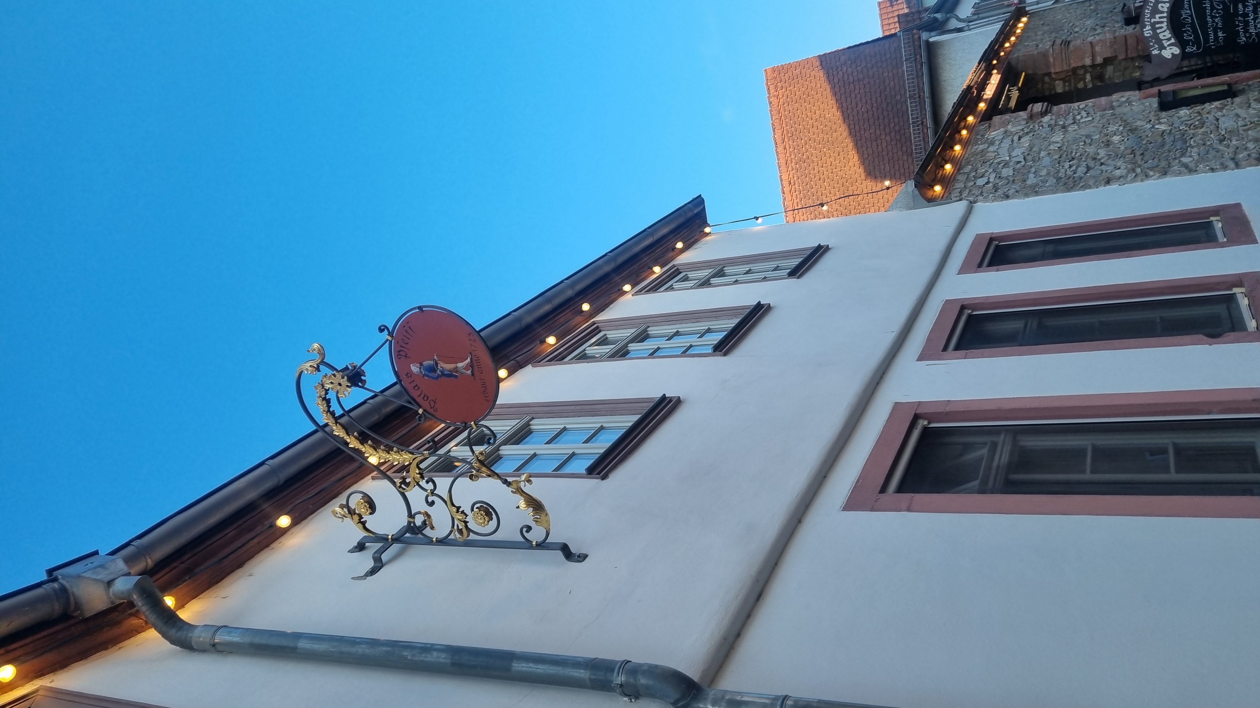 조용하고 정겨운 독일 골목길, 저 멀리 파란 깃발 아래로 **‘Alt-Oberurseler Brauhaus’** 프랑크푸르트에서 S-Bahn 전철로 20분 남짓이면 도착하는 마을. 오버우르젤(Oberursel)에서 만난 이곳은 전통 수제맥주와 독일식 음식이 모두 완벽한 로컬 브로이하우스입니다.